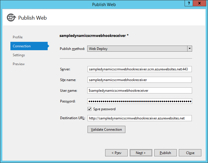 The URL of the WebHook receiver should be in the format https://<host>/api/webhooks/incoming/dynamicscrm/<id>. In this example, the host name is “sampledynamicscrmwebhookreceiver.azurewebsites.net”. Here we have neglected to enforce that the WebHook receiver use HTTPS. It is recommended that you use HTTPS for your business application for enhanced security. We have also provided an id and a shared secret that identifies CRM to the WebHook receiver. You should provide your own application secret for your business application. As always, use high-entropy values such as a SHA256 hash or similar. You can also set your application secret through the Azure Portal instead of hard-coding it in the Web.config file.