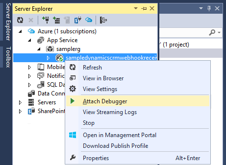 Once your web application is published, open the Server Explorer pane in Visual Studio and navigate to your web application under Azure > App Service. Right-click on the web application’s entry and choose Attach Debugger, then set a breakpoint in the WebHook handler.