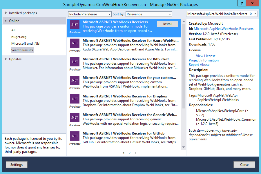 Add the NuGet package for the ASP.NET WebHooks receivers for CRM to your web project in Visual Studio using the NuGet package manager, or by typing Install-Package Microsoft.AspNet.WebHooks.Receivers.DynamicsCRM -Pre into the package manager console. This example uses a Web API project created from the default Visual Studio ASP.NET project template. Remember that ASP.NET WebHooks is a preview package, so you must select Include Prerelease in the NuGet package manager window to install it.