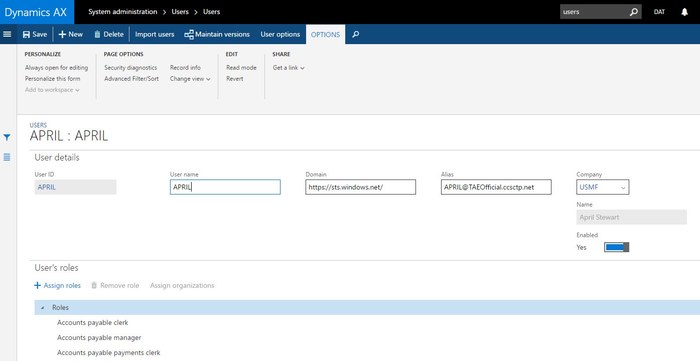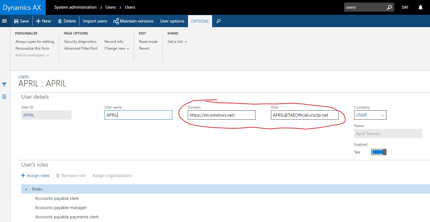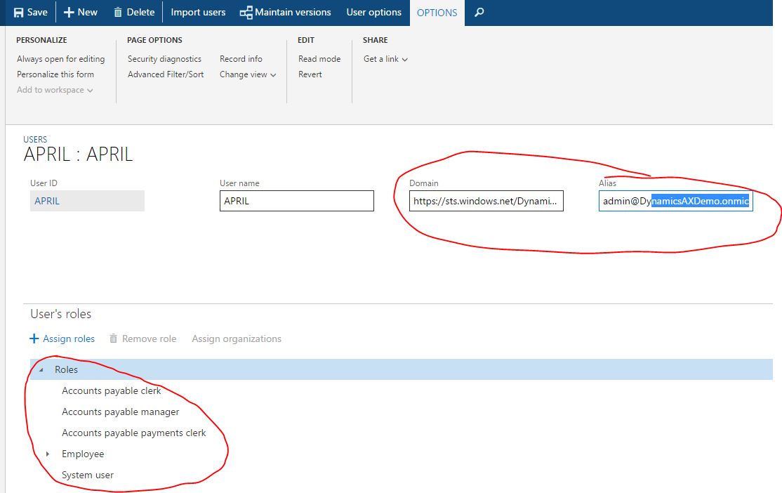 5. Now edit the record for April, enter the domain and alias of the new AAD user who wants to have the same security roles as April. You can follow my previous blog post to learn how to invite a user to an AX instance.