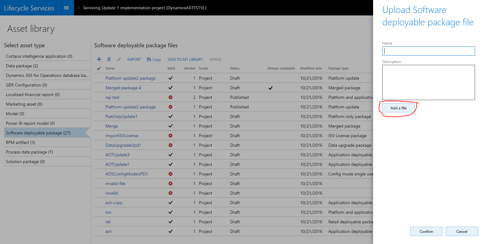 1. In LCS, click the Asset library tile. Select the Software Deployable Packages tab, and then click Add.