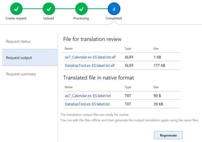 10. When the request is complete, you can download the translated output files from the Request output tab. You will be provided the output in two formats: