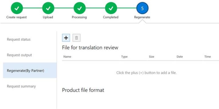 11. If you reviewed and edited an XLIFF file, you will want to regenerate the file in native format so you can apply your edits to the product. Click Regenerate and follow the steps to upload the edited XLIFF file and get the regenerated native format. Note that this does not overwrite the output files the translation service originally created for you. The regenerated files will be available from the Regenerate (By Partner) tab.