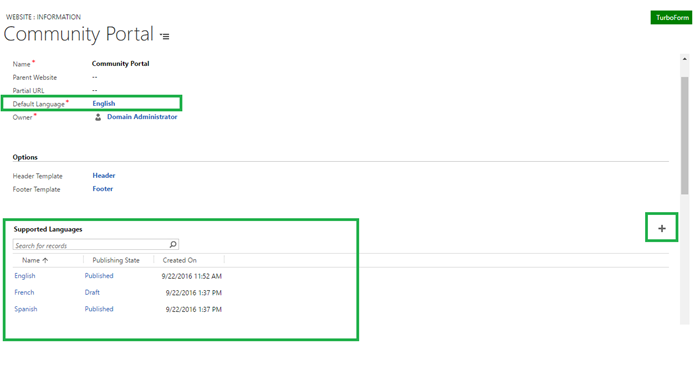 To make Portal capabilities for Microsoft Dynamics 365 available in an additional language you need to activate that language in your Dynamics 365 organization first. Once the language is activated on the Dynamics 365 org, you can navigate to your Website record and add that language as a supported language using the “+” button.