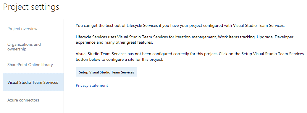 LCS project settings: Set up Visual Studio Team Services