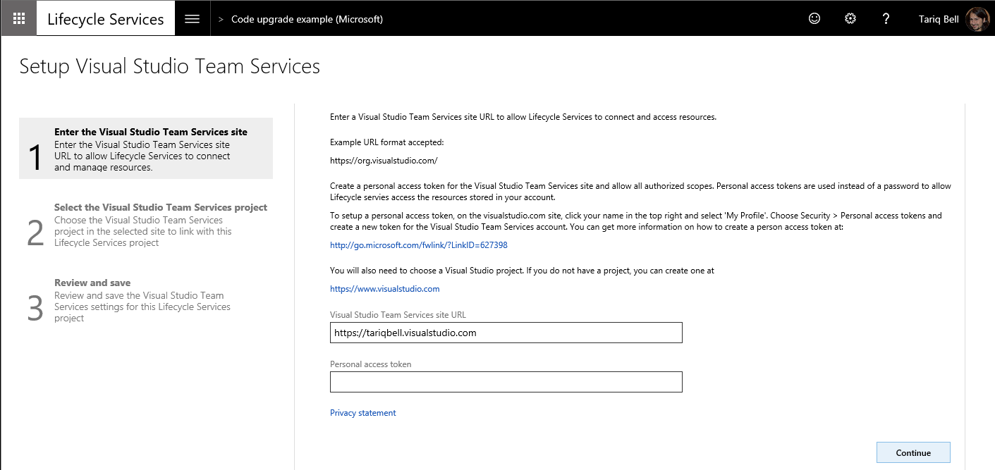 - Enter the root URL for your VSTS account and the access token that you created earlier, and then click Continue.
