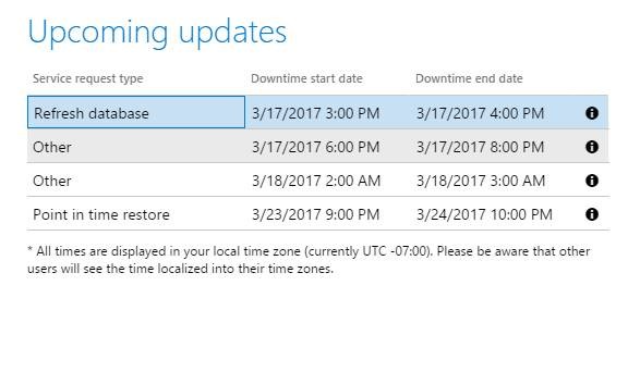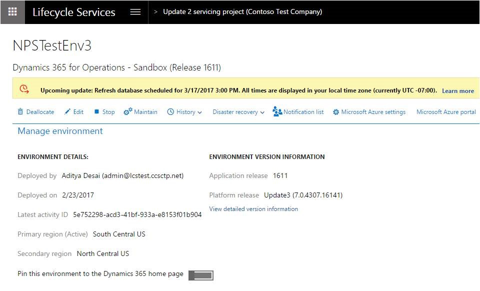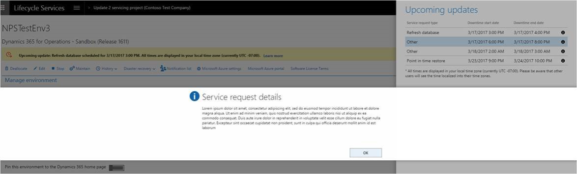 In the March release of LCS, you can view upcoming updates for your environment. You can view the scheduled updates by clicking Maintain > Upcoming updates . Any maintenance to the environment that you initiate (package deployment on a specific day, sandbox refresh, point-in time restore, etc.), will be shown in the update list.