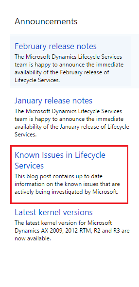 We now have a permanent page in the LCS Blog that will be kept up to date with the known issues in Lifecycle Services that Microsoft is tracking and is currently investigating. This can be accessed from the Announcements section on the LCS dashboard.