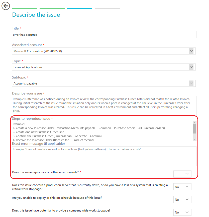 New fields have been added to the Describe the issue page to provide more detailed information for support engineers. These new fields are: