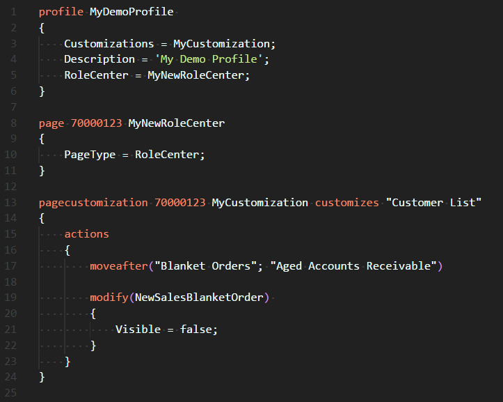• We announced the availability of tenant-specific profiles with our June update. We now offer new AL object types; Profile and Page Customization. These new objects let you define a set of pre-defined profiles and include them in your extension. The Page Customization object is very similar to a Page Extension object, but more restricted. As of now Page Customization can only include moving of controls and actions as well as setting Visiblity to true/false. It cannot contain variables, functions, or triggers.