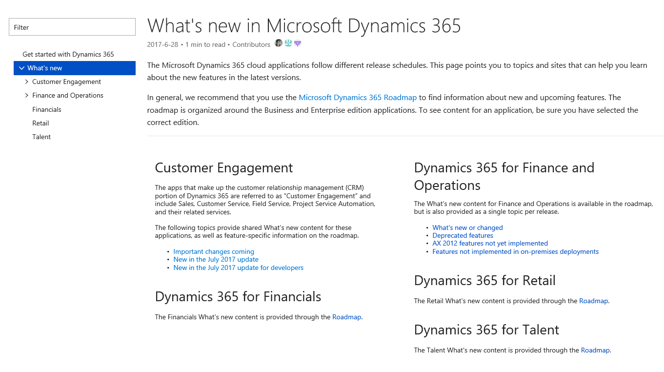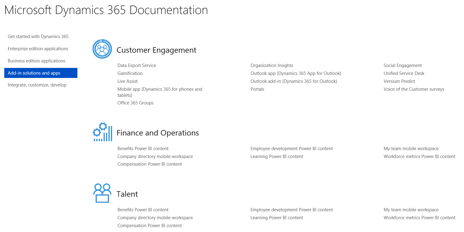 Content for the following Customer Engagement solutions is also available now on docs.microsoft.com/dynamics365: