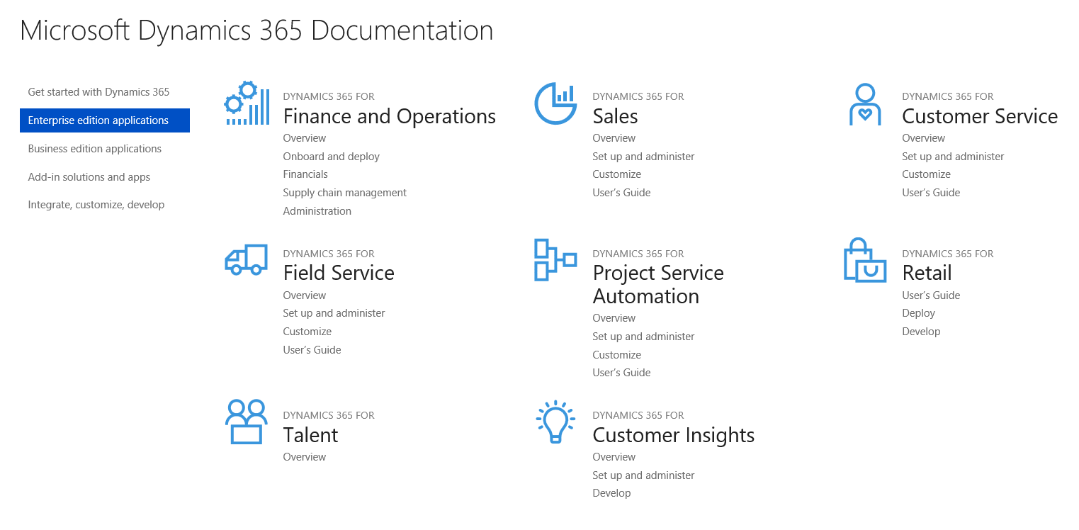 For example, if you’re working with one of the Dynamics 365 enterprise applications, go to the Enterprise edition applications page. You’ll find a simplified set of links for each app, so you can quickly zero in on the right set of content for your role.