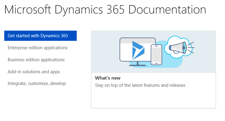 Looking for documentation on Dynamics 365? Check out our new Dynamics 365 documentation site at docs.microsoft.com/dynamics365. The new site provides a quick and intuitive way to drill down to just the Dynamics 365 content you need.