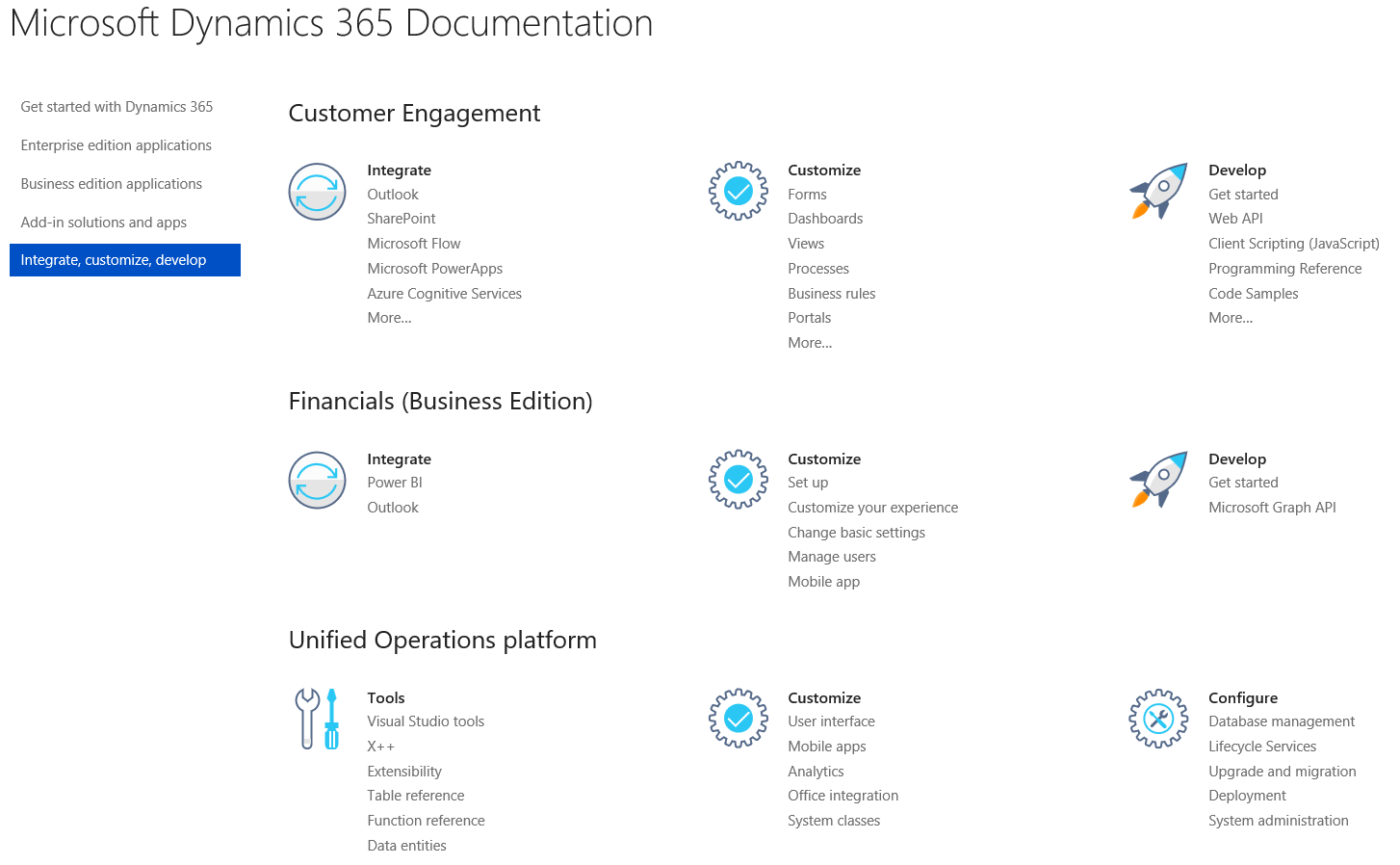 If you’re a customizer or developer, there’s a single page, Integrate, customize, develop, that describes everything you can do with the Dynamics 365 platform, whether you’re using the Customer Engagement (CRM) apps, Dynamics 365 for Financials Business edition, or Unified Operations apps.