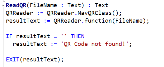 In the Development Environment, create a new Codeunit called “QR Code Management” – or whatever you like – and add the following global function. DotNet data type runs as per default server-side.