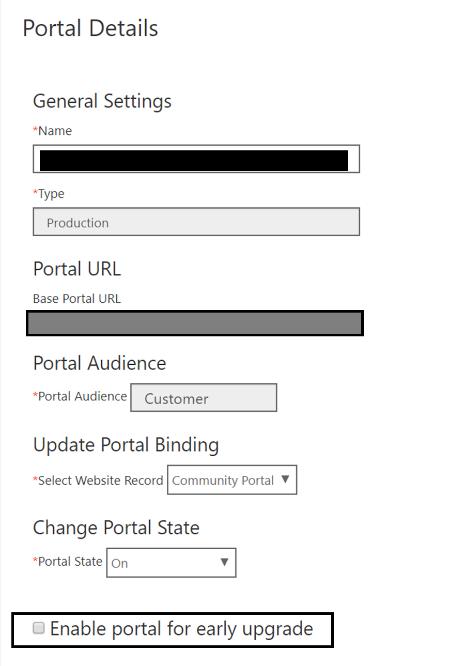 - To mark any Portal for early upgrade, you can go to Portal Admin center for that portal, go to Portal Details tab and select Enable portal for early upgrade