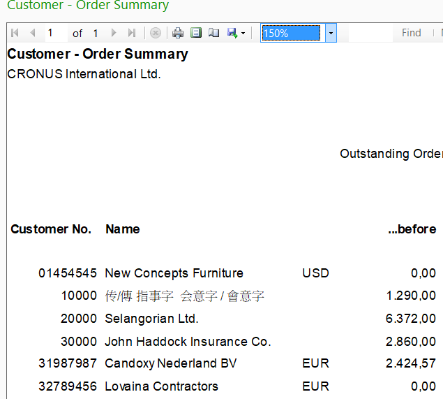 - Go back to the customer list, and from Report action group, run the report Customer – Order Summary.