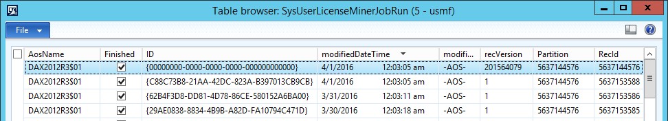 • On the application side, a new table SysUserLicenseMinerJobRun was created and is used to control the execution of this task in a multiple-AOS system (the task should be executed by only one AOS to save resources) and to hold the history on those executions.