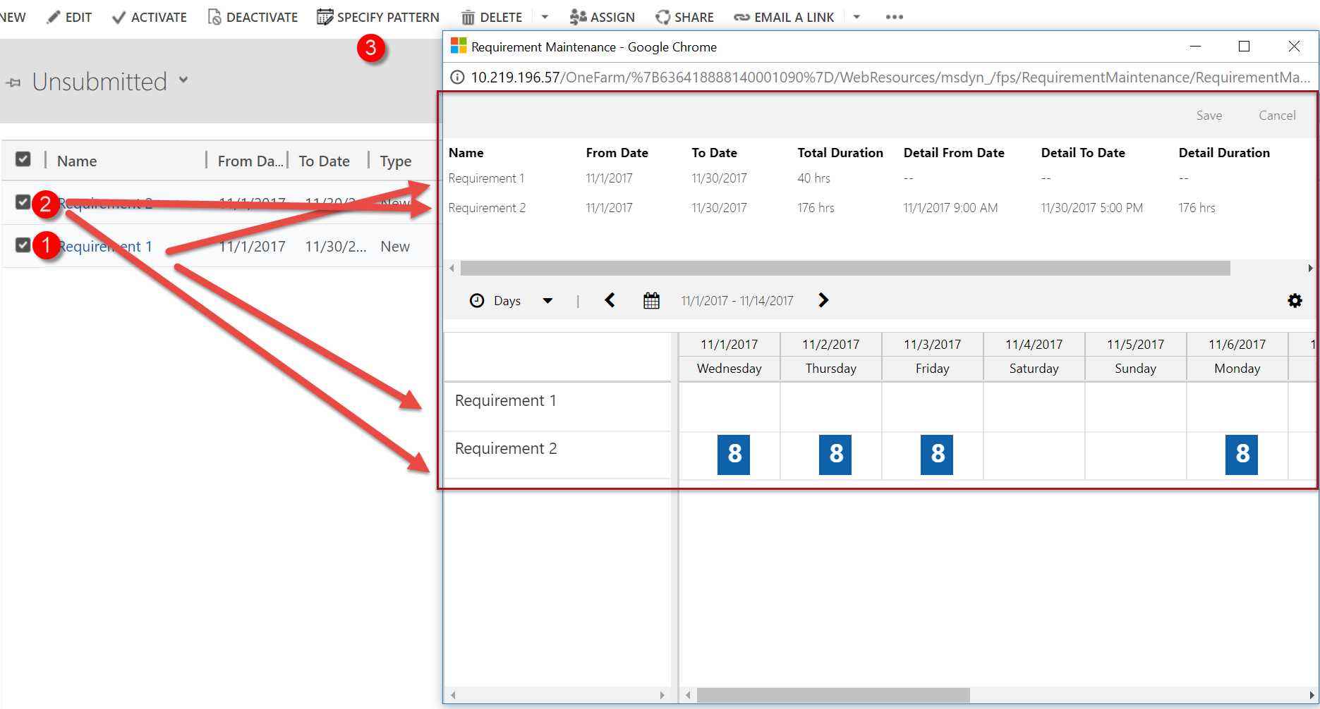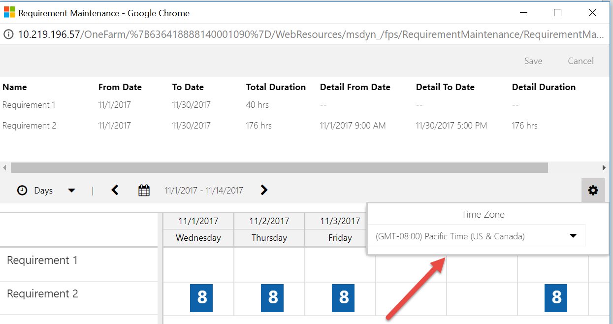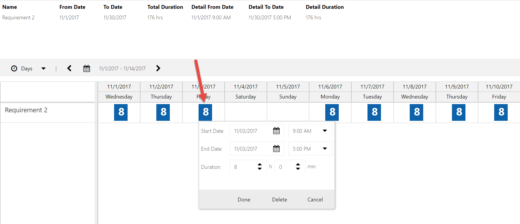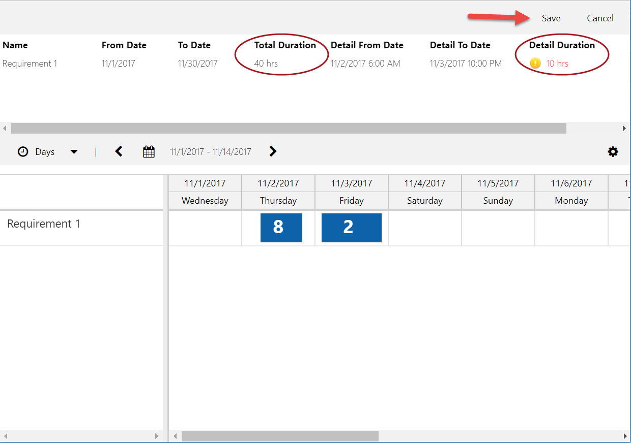 - The changes and creation of new requirement details does not get saved until the user clicks “save” on top of the board, at which point validation logic will kick in and let you know if you made changes to the requirement details which do not match the requirement itself. The dates of the requirement details must fall within the requirement dates, and the duration on the requirement must match the aggregate duration of all the requirement details.