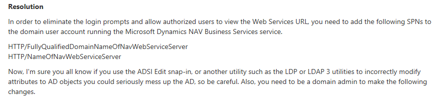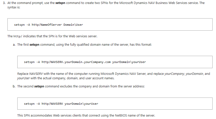 We, the Microsoft Dynamics NAV Support Team in the Customer Service and Support (CSS) department, see from time to time cases asking for the Service Principal Names (SPN) that are required for Dynamics NAV Web Services (WS) to run properly on a three-tier environment with Kerberos enabled.