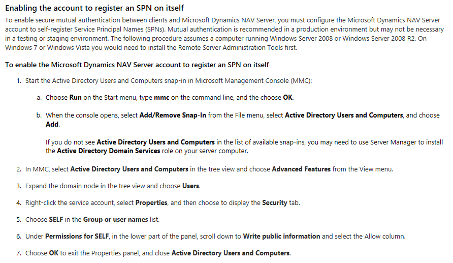 This was the reason why we had to enable the Dynamics NAV Server account to register an SPN on itself: