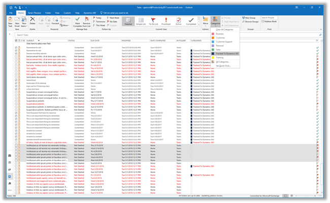 With the latest release of Dynamics 365 (online) version 8.2, we are providing the capability to track emails, appointments, and tasks in Outlook with a special Outlook category enabled through server-side synchronization. Assigning this special Outlook category to an email, appointment, or a task in Outlook will track the item to Dynamics 365. Similarly, removing the category from a tracked email, appointment, or task will untrack it in Dynamics 365.