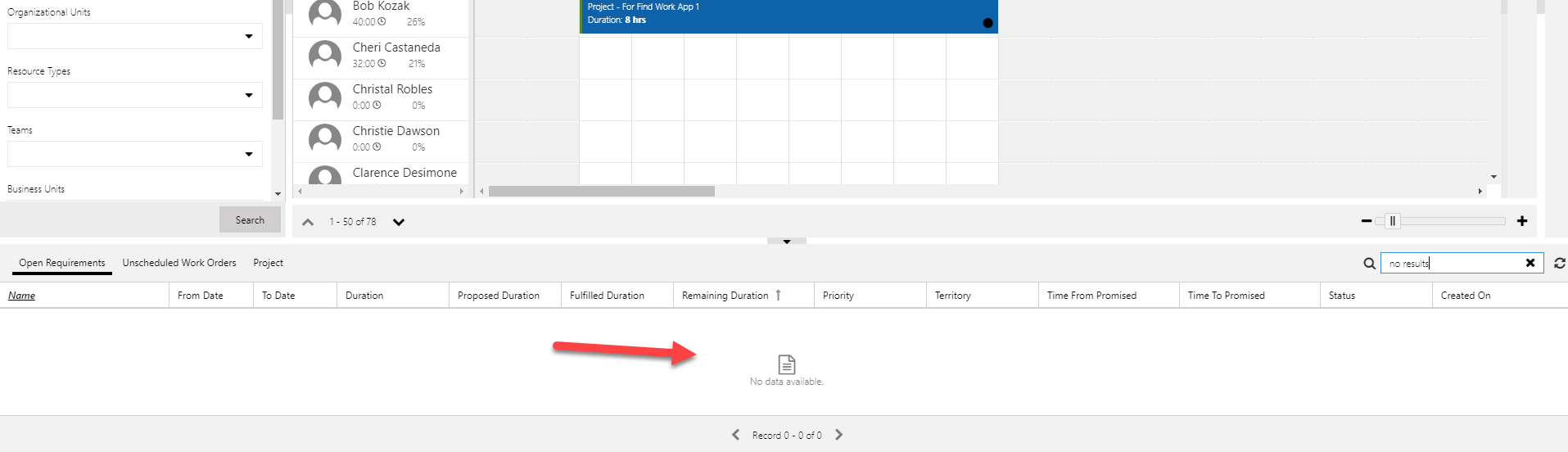 - Resource managers often search through the booking requirements grid at the bottom of the schedule board. We wanted to make the interaction more responsive in case there are no results that match the search criteria. Instead of whitespace, a message is shown to the user.