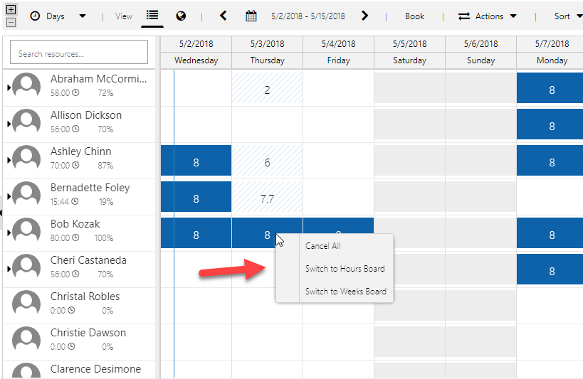 - A few releases ago, we introduced the ability to seamlessly change your Schedule Board view between hourly, daily, weekly, and monthly, without losing context of the resource and date you are focused on. You can simply right-click to “zoom in” or “zoom out,” which changes the Schedule Board view. To make the feature a bit more understandable to new users, these labels are changed, and dynamically describe the action more explicitly. For example, if you are on the daily board, upon right-clicking, the options will be “Switch to Hours Board” (previously “Zoom In”) and “” (previously Zoom Out”).