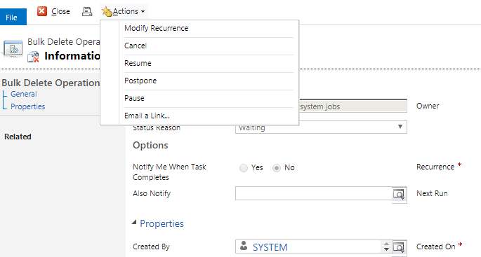 If you open one of these recurring bulk deletion system job records, you can see the query the job uses to identify which records to delete as well as the schedule the job runs on. For these out of the box system jobs, you cannot modify the query used by the system job, but you can modify the schedule the job runs on. If you update the view selector to show jobs that have already been scheduled, in-progress or executed, you can cancel / resume / postpone the job. You can find these options in the ‘Actions’ menu if you open the record.