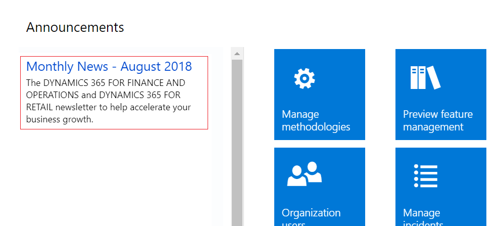 We are pleased to announce the availability of the Dynamics 365 for Finance and Operations and Dynamics 365 for Retail Newsletter in Lifecycle Services. This will be a monthly newsletter highlighting key announcements and spotlighting features in the products that you can use. There are also a set of resources on the road-map, how-to videos and tech talks. The August 2018 version  is now available for download. To view the newsletter navigate to Lifecycle Services and check the Announcements section.