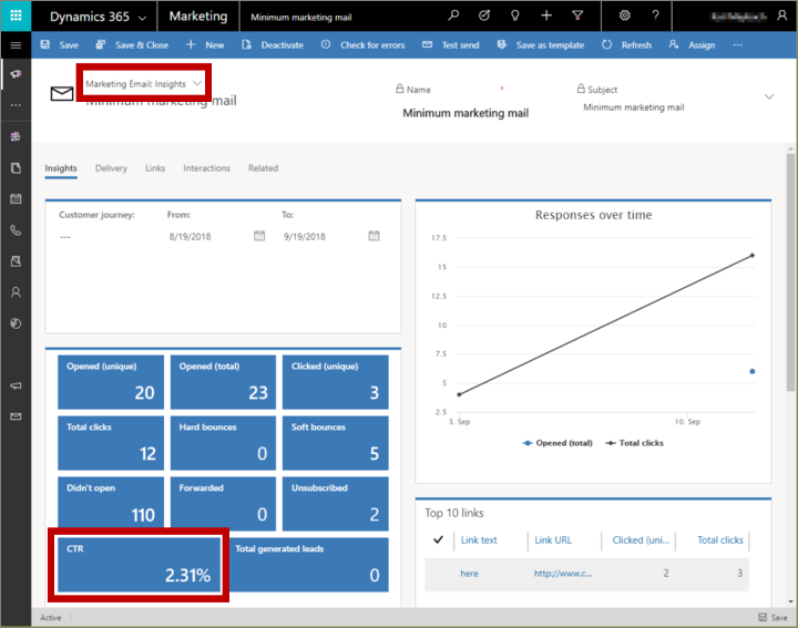 To see the CTR for a message, open the message in Dynamics 365, switch to the Marketing Email: Insights form view and look for CTR among the other key performance indicators (KPIs) on the Insights tab.