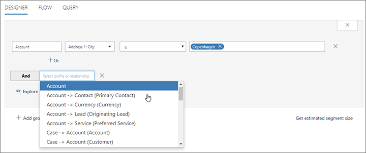 The segment designer in Dynamics 365 for Marketing enables you to set up detailed logical expressions for finding the contacts to include in each segment. You can even traverse across database tables to find contacts associated with a wide variety of related entities, such as event registrations, accounts, leads, and much more.