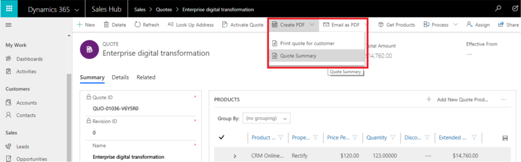 When a customer is ready for a formal proposal that contains the most current pricing information and product quantities, they are generally presented with a quote. Until now, a salesperson using Dynamics 365 for Sales could generate quote documents only in Word format using Microsoft Office templates. They then had to convert the Word docs to PDF manually and then share them with customers. With PDF generation from quotes generally available, salespeople can now quickly create PDF quote documents based on standard templates to share with customers. With PDF generation from quotes, salespeople can: