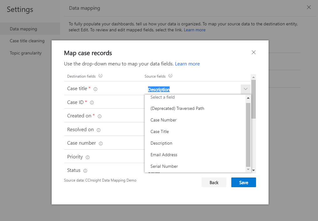 With the latest release, we are showing single-line and multi-line fields in the dropdown for custom field mapping. Because Customer Service Insights uses the Case title field to group similar cases into topics, if you have a multi-line text field (for example, a Description field) that better describes user issues in support cases, you can now map it to Case title to generate better topics. We are currently enforcing a character limit of 512 for multi-line fields to prevent topics from being too long.
