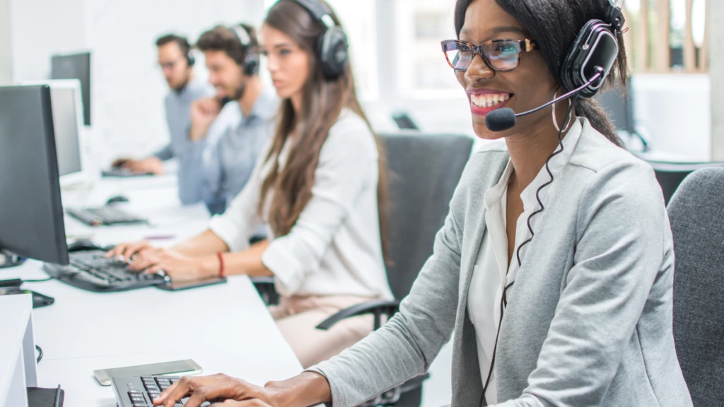 A group of customer service representatives with headsets on.