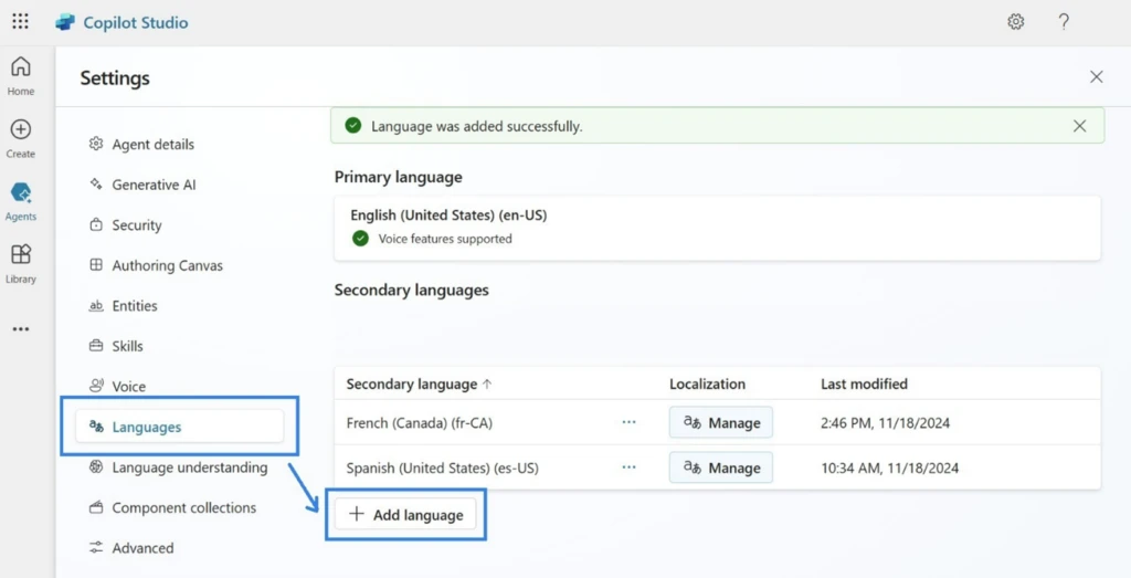 Voice agents are IVR bots that make use of the capabilities of Copilot Studio. With multilingual voice agents, contact centers no longer need separate bots for each language. A single voice agent can support multiple languages, work with unified business logic and integrations, and be deployed across all languages with just one click. This can help organizations to: