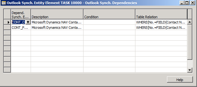 - Close the Outlook Synch. Entity Element Task 10000 – Outlook Synch. Dependencies form