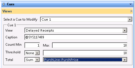 By doing this, you are entering edit mode for the role page. The Web Part property editor for the Cues Web part will appear in the left side of the page. There we can select Cue to modify (the Cues Web part can show up to 6 different Cues) and choose one of the existent Cues. We have chosen the Delayed Receipts Cue.