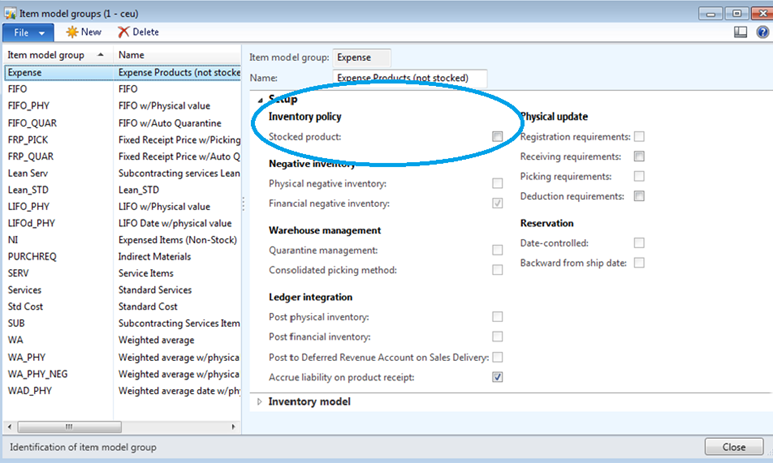 With Microsoft Dynamics AX 2012 new capabilities of selling and procuring, decoupled from inventory control, have been introduced. This non-stocked trade is being supported by a new policy called stocked product on the item model group.