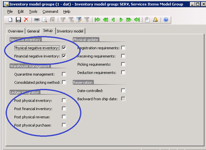 In the inventory model group, negative physical and financial inventory must be allowed for service items. Furthermore, all ledger integration options, particularly the Post financial inventory must be left blank. This will ensure that, in the example of purchasing the car service, an expense account will be used for receipt transactions.