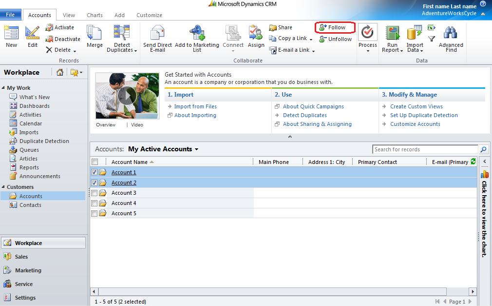 If you want to follow multiple records of the same type of entity, you can do so from the Entity Grid. Select the records you want to follow and click on the Follow button in the ribbon as shown below.