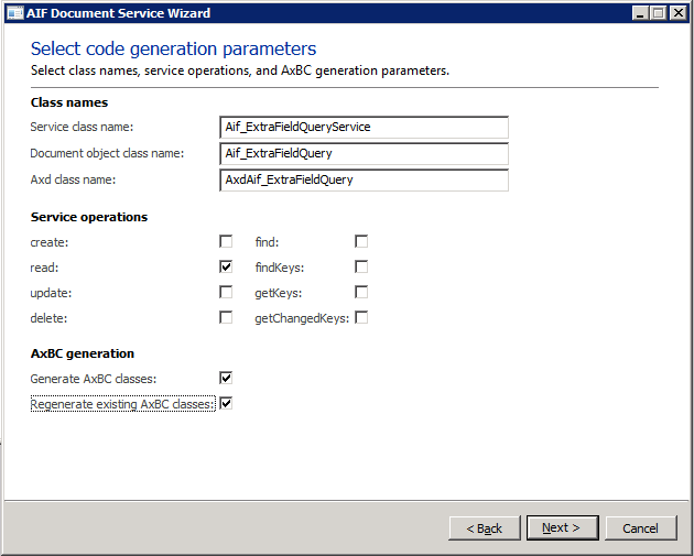 For now, we will start with new table and new query. When you generate document services by wizard, make sure that Generate AxBC class is checked.