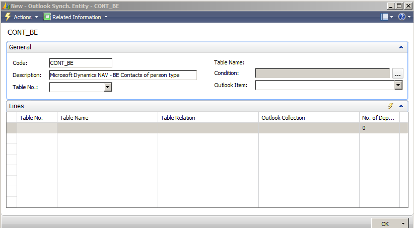 The scenario is as follows. We want to split the Dynamics NAV contacts of person type in Belgium ones and Dutch ones. We first delete the CONT_PERS entity. To do so, start up RTC and select CRONUS International Ltd./Departments/Administration/Application Setup/Microsoft Office Outlook Integration/Outlook Synch. User Setup. Manually select all lines and either press CTRL+DEL or right click and select Delete. Second step is to delete the CONT_PERS entity. To do so, follow these steps. In RTC, select CRONUS International Ltd./Departments/Administration/Application Setup/Microsoft Office Outlook Integration/Outlook Synch. Entities, select CONT_SP and press CTRL+SHIFT+E or right click the entity and select Delete. Confirm the deletion that collections will be updated automatically.