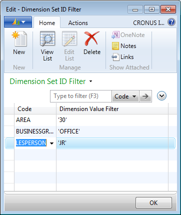 The new page that I added opens, and you can use the lookup on the Code column and the Dimension Value Filter field to select the values you want filtered as shown in the following screenshot: