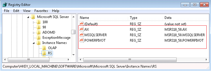 “MSSQLSERVER”=”MSRS10_50.MSSQLSERVER”