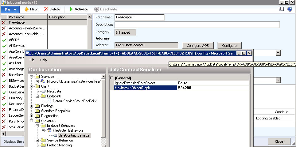 Dynamics AX 2012 Cumulative Update 3 (KB2709934) ). Please contact Microsoft Dynamics Ax Support if you want only separate hotfix and it is still not available on PartnerSource. After installing hotfix on “Inbound ports” form for File Adapter you should find new button “Configure AOS” which will allows you to open WCF editor.