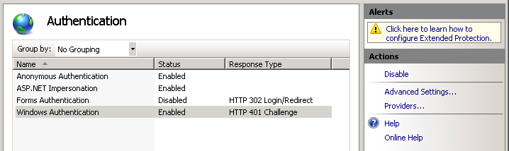 For deployments that are not using Kerberos as the authentication protocol, first determine whether the servers (IIS Security Configuration) are configured to support only NTLM, in which case you should configure additional authentication provider using the instructions below. If the servers are instead configured to use the Negotiate security package, which for one reason or another cannot take advantage of using Kerberos, review the configuration to identify why Kerberos authentication is failing.