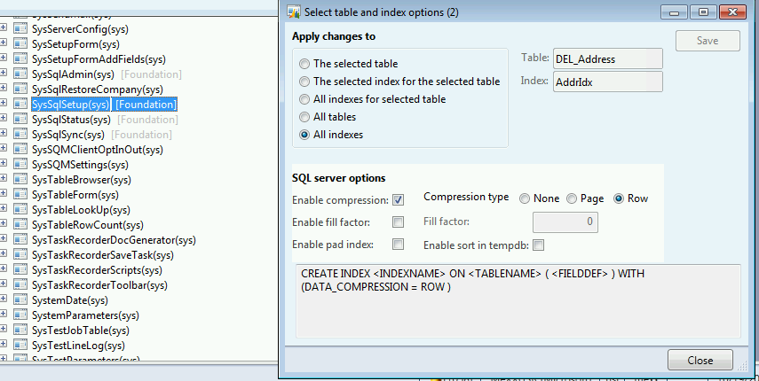 The form SysSQLSetup is used to set the compression and index options. This form can only be found in the AOT.