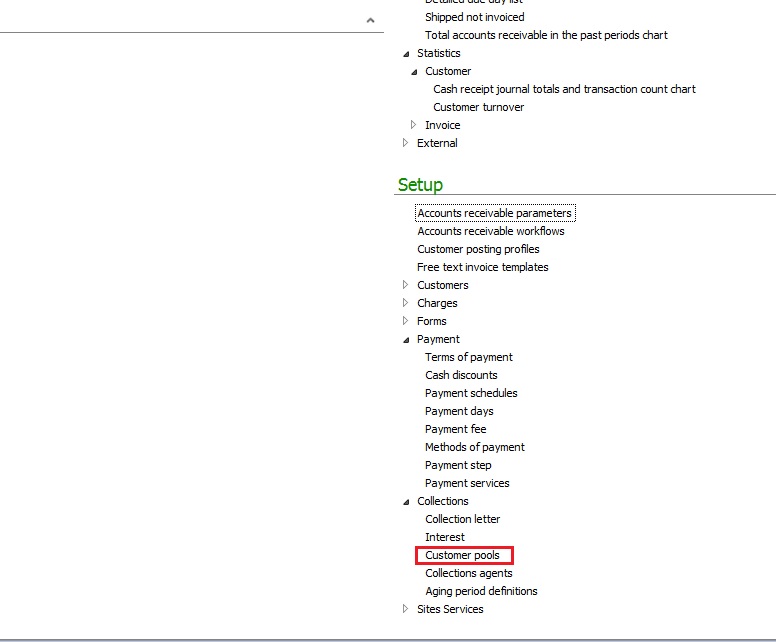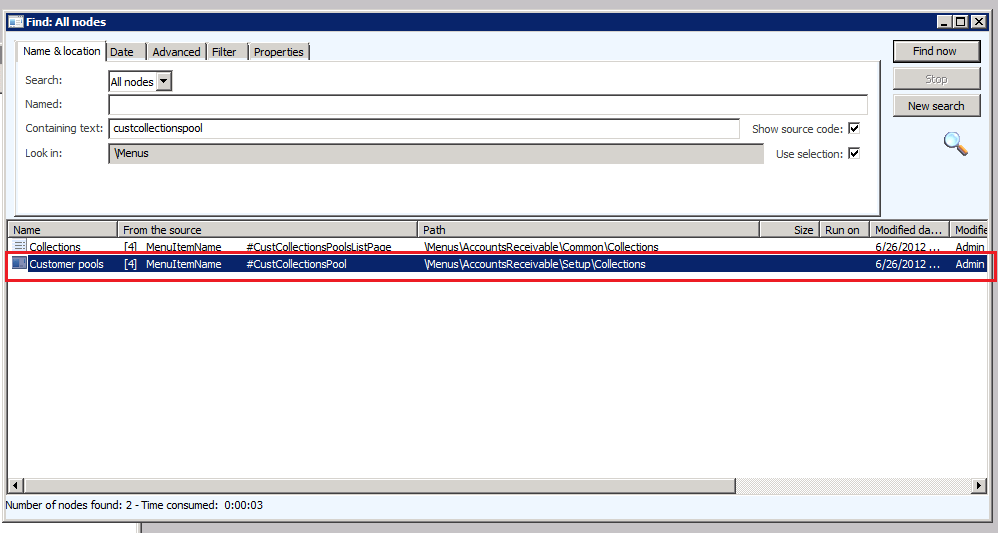 5. Note how the search returns a menuitem called ‘CustCollectionPool’ and this is located under Menus\AccountsReceivable\Setup\Collections