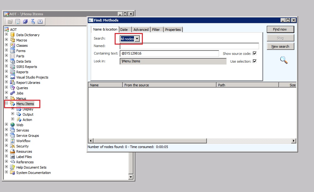 4. Now do a search in your menu items AOT node for this labelID and remember to mark ‘All nodes’ as we need to search on properties also. To start the find screen, rightclick on the menuitems node and select ‘Find’